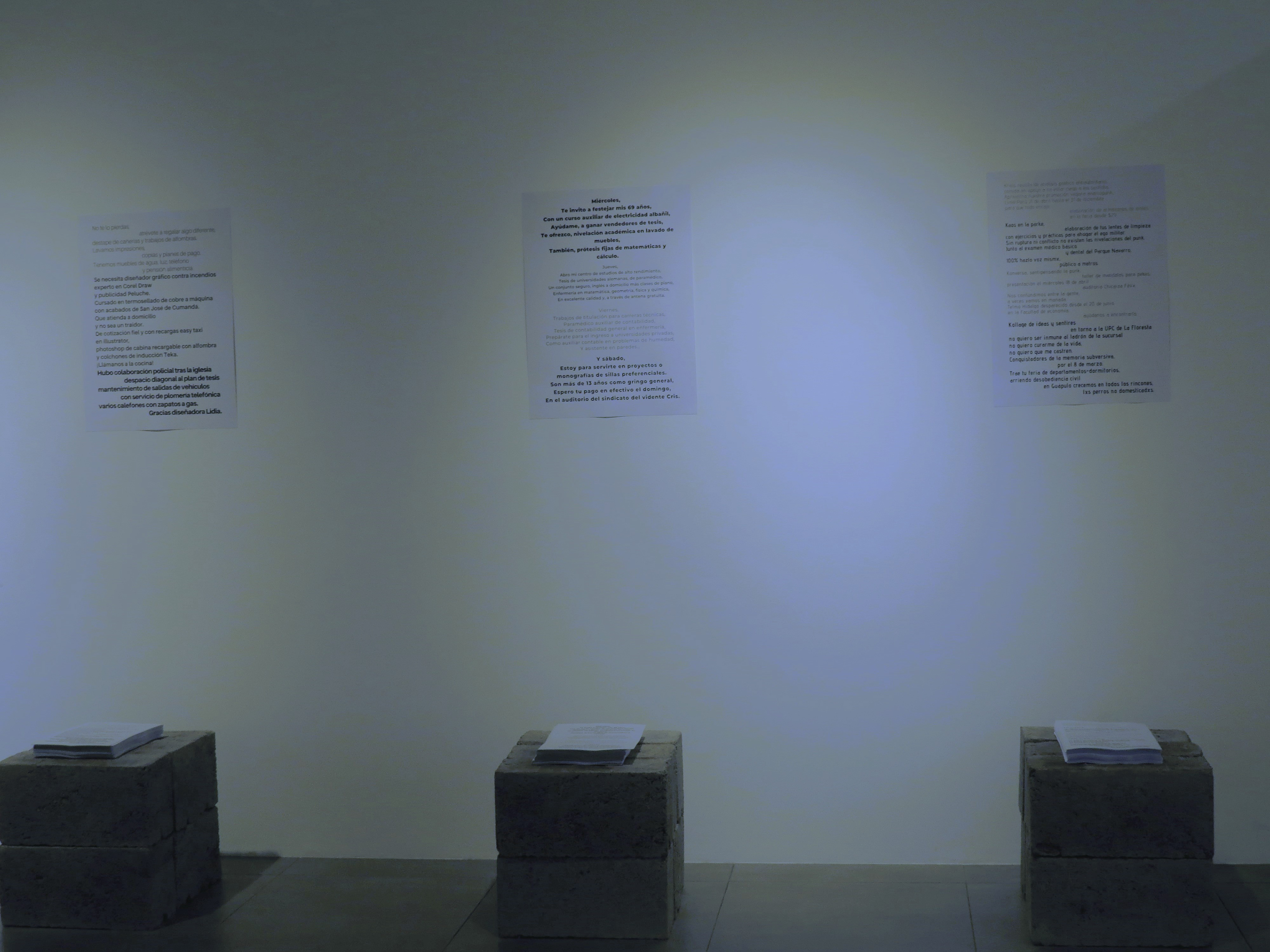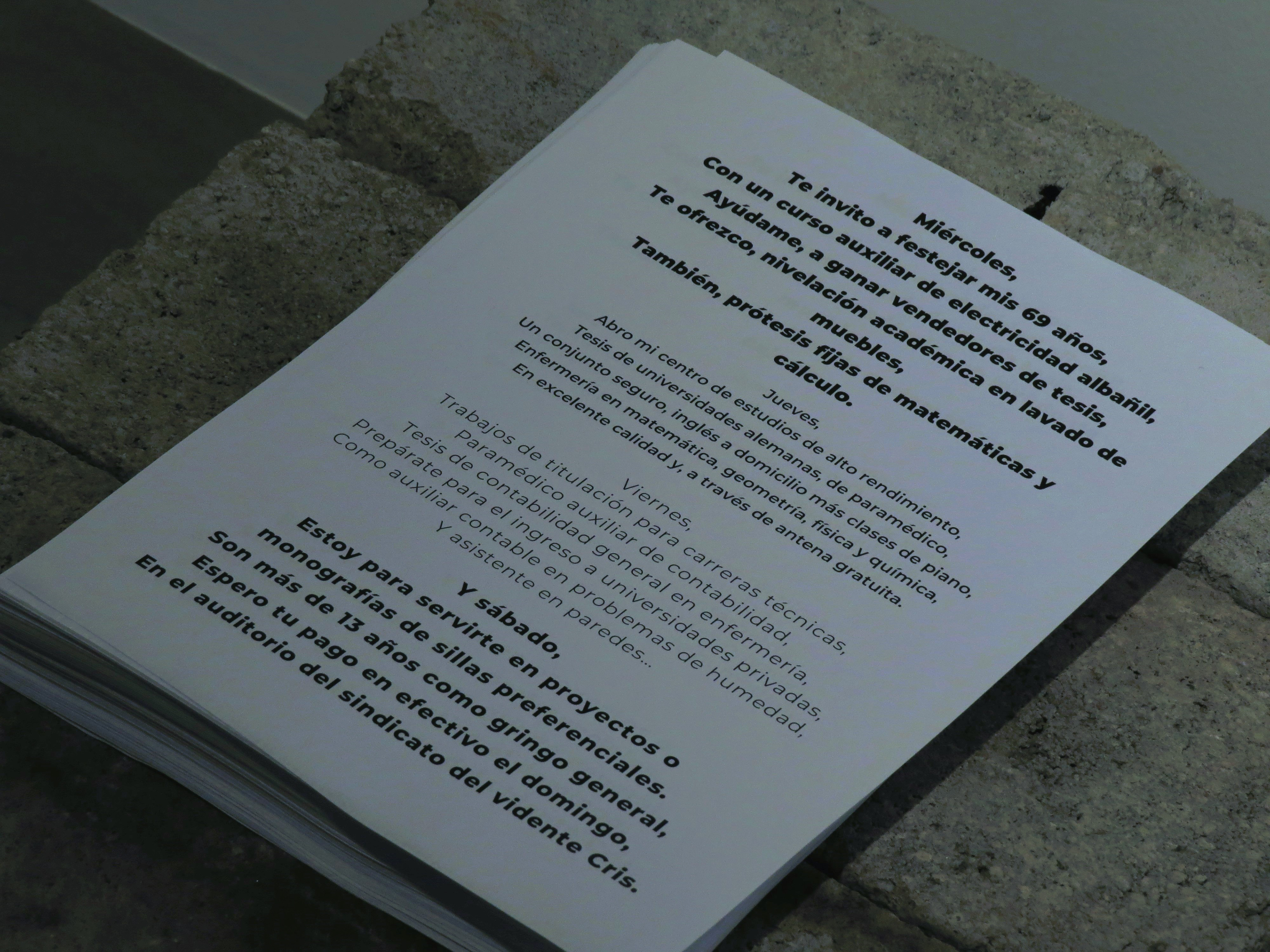 Arte Poetica (Poetica Art) interprets Ecuadorian-Quitoan language and graphics outside the formal frameworks of representation. Through the appropriation of words displayed on the street in the advertisement or poster format, I use their dialect to compose poetry that questions the identity construction of the Ecuadorian citizen. Thus, I return to the city the words taken, inside and outside the gallery space. The work seeks to highlight an aspect of local culture that we usually ignore, which is also part of the foundations of our environment. I consider it pertinent to question the established paradigms, such as assuming that we live in a city with a specific culture without a deep understanding of all the layers of it. The Poetic Art series takes its name by becoming a statement against the social, cultural, and political spectrum. It is the appropriation of the title of the poems where their authors express their relationship with poetry, defining their creation process by expressing their belief through the poem that works as a statement. This series appropriates this gesture in the practice of poetry and transfers it to the domain of Contemporary Art. In this way, it becomes a position taken by the artist and, in turn, becomes a call to reflect on the artistic and cultural practices of the local scene.