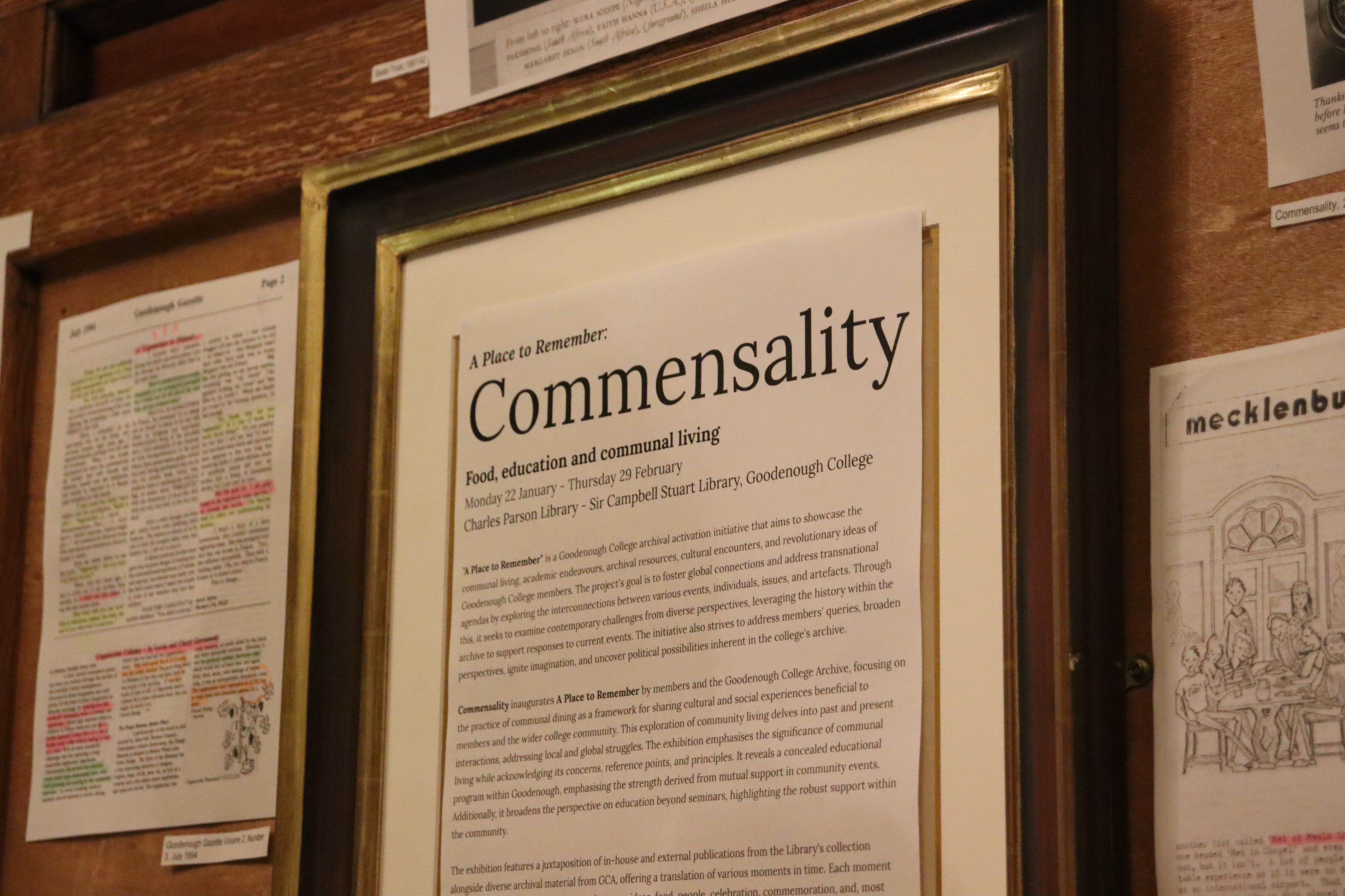 "A Place to Remember" is a Goodenough College archival activation initiative that aims to showcase the communal living, academic endeavours, archival resources, cultural encounters, and revolutionary ideas of Goodenough College members. The project's goal is to foster global connections and address transnational agendas by exploring the interconnections between various events, individuals, issues, and artefacts. Through this, it seeks to examine contemporary challenges from diverse perspectives, leveraging the history within the archive to support responses to current events. The initiative also strives to address members' queries, broaden perspectives, ignite imagination, and uncover political